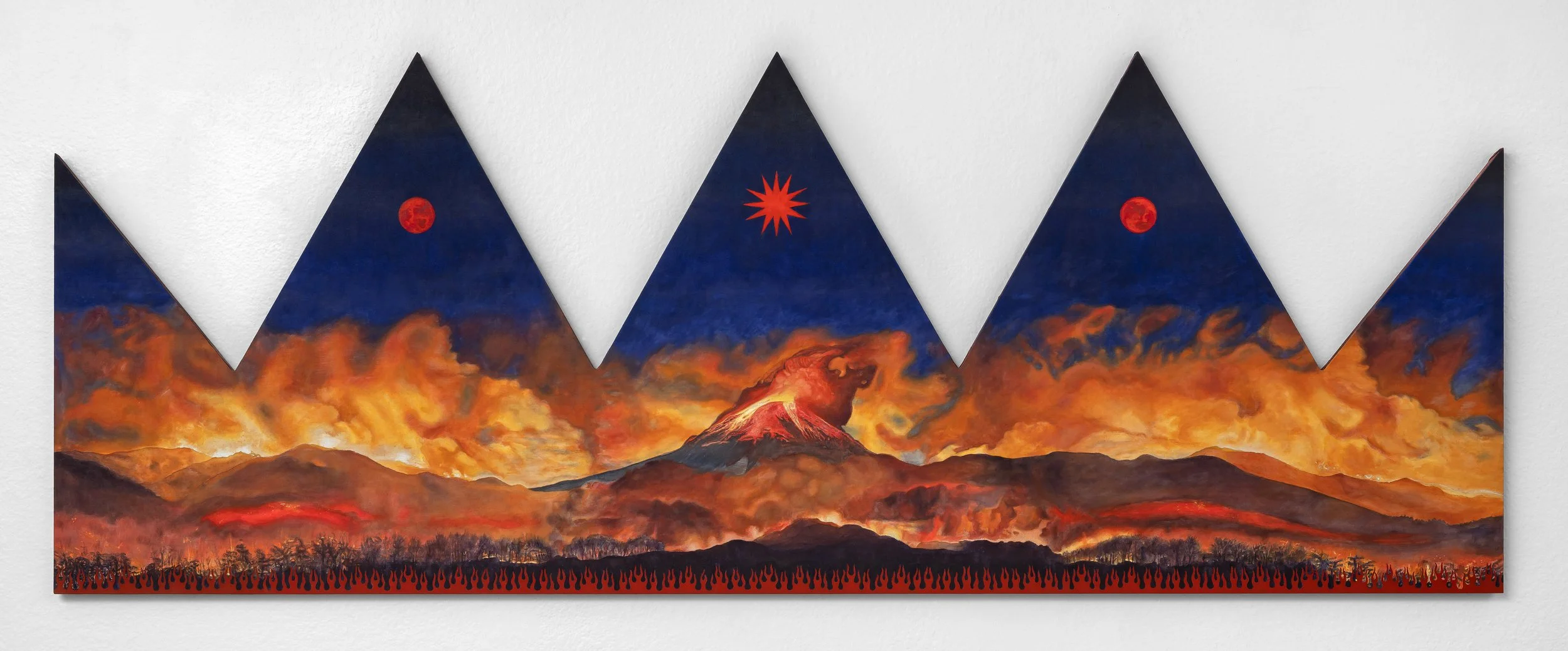 “Blood Moon Inferno” acrylic, gouache and colored pencil on linen over panel. 22.5in x 60in. 2025